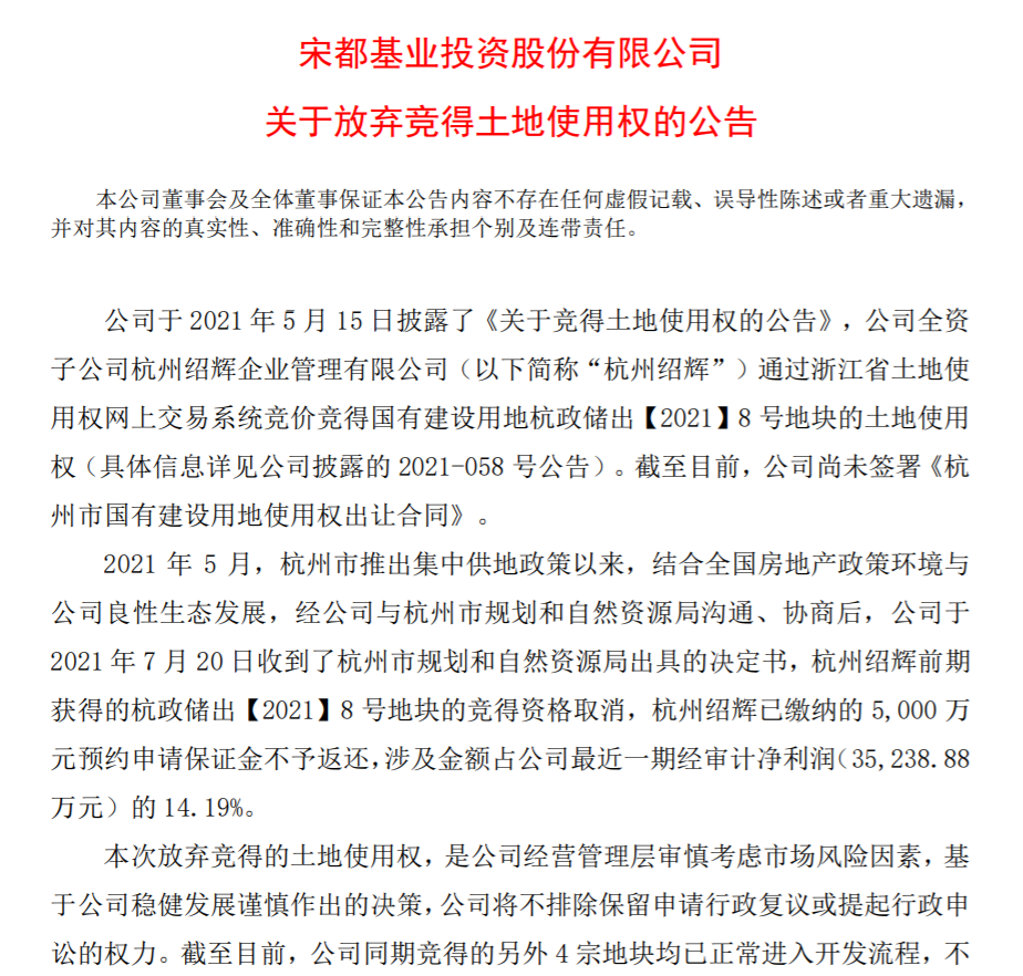 根据公告,拍下杭政储出【2021】8号地块后,宋都股份一直未签署《杭州市国有建设用地使用权出让合同》,“结合全国房地产政策环境与公司良性生态发展,公司与杭州市规划和自然资源局沟通协商后,于7月20日收到了杭州市规划和自然资源局出具的决定书”。