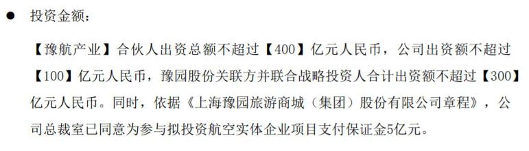 今年5月,A股公司豫园股份公告称,拟联合公司关联方、航空产业战略投资者等,共同设立合伙企业并以该等合伙企业投资航空实体企业。拟设立的合伙企业为豫园航空产业合伙企业(有限合伙)(暂称“豫航产业”),出资总额不超过400亿元,其中豫园股份出资额不超过100亿元。